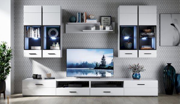 Белые глянцевые фасады МДФ и витрина с прозрачным стеклом сделают Вашу гостиную светлее и уютнее. Задняя стенка пенала-витрины Йорк черного цвета красиво контрастирует с фасадами и корпусом белого цвета. Светодиодная подсветка сделает акцент на дорогих для Вас вещах, таких как фото, статуэтки, сувениры. Регулируемые навесы, которыми оснащен пенал, позволят после подвешивания отрегулировать его положение. Пенал-витрина выполнена из экологически безопасных материалов.