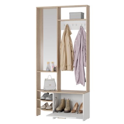 Компактная прихожая Тео – готовое решение для современной малогабаритной прихожей. Здесь есть все составляющие – зеркало с полкой для разных полезных мелочей, верхняя полка для головных уборов, просторная зона с крючками для верхней одежды, нижние открытые и закрытые полки, в которых можно хранить сезонную обувь. Регулируемые опоры позволяют установить прихожую на любой неровной поверхности. Высокое качество по приятной цене — это прихожая Тео.