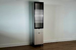 Шкаф оснащён надёжной металлической ручкой и имеет удобное внутреннее наполнение: надёжные полки за стеклянной и глухой дверцами, а также выкатной ящик. Это позволяет рационально использовать пространство.